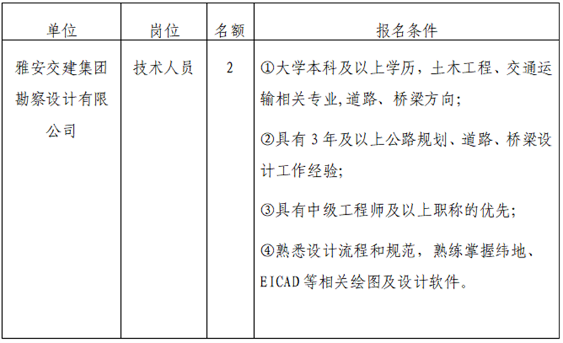 根據(jù)發(fā)展需要,決定面向社會(huì)公開招聘雅安市交通建設(shè)(集團(tuán))有限責(zé)任公司(以下簡(jiǎn)稱“雅安交建集團(tuán)”)所屬子公司工作人員2名,現(xiàn)將有關(guān)事項(xiàng)公告如下: