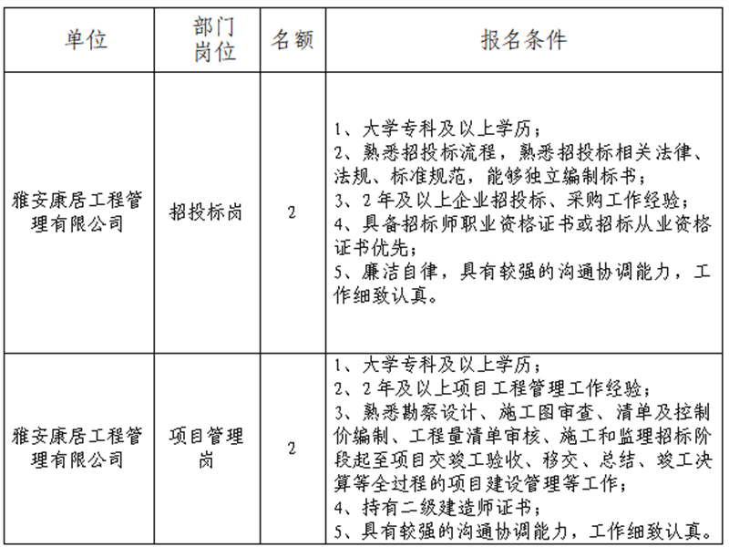 雅安交建集團(tuán)關(guān)于公開招聘所屬子公司工作人員的公告(康居公司)