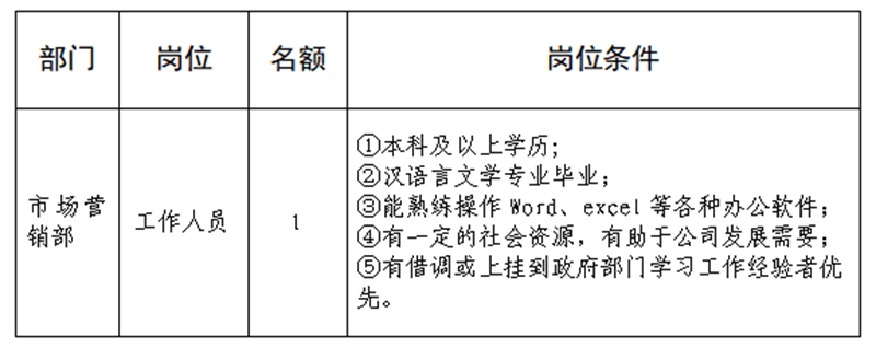 根據(jù)發(fā)展需要,決定面向社會公開招聘雅安市交通建設(集團)有限責任公司(以下簡稱“雅安交建集團”)所屬子公司工作人員1名,現(xiàn)將有關事項公告如下: