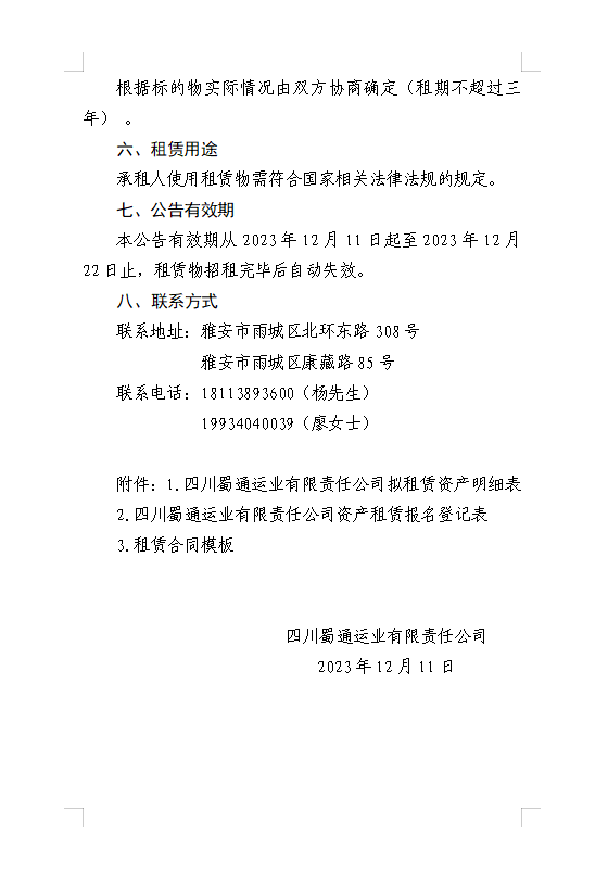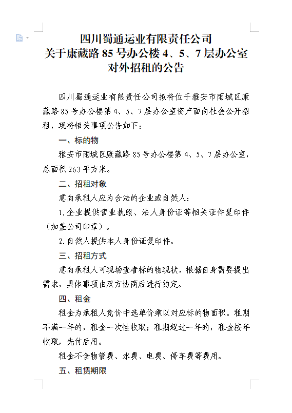 四川蜀通運業(yè)有限責任公司關(guān)于康藏路85號辦公樓4、5、7樓資產(chǎn)租賃公告附件