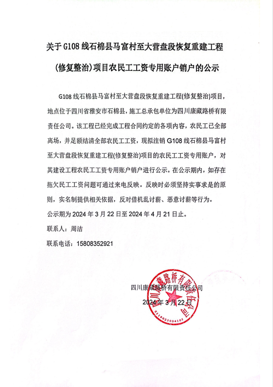 關于G108線石棉縣馬富村至大營盤段恢復重建工程(修復整治)項目農民工工資專用賬戶銷戶的公示