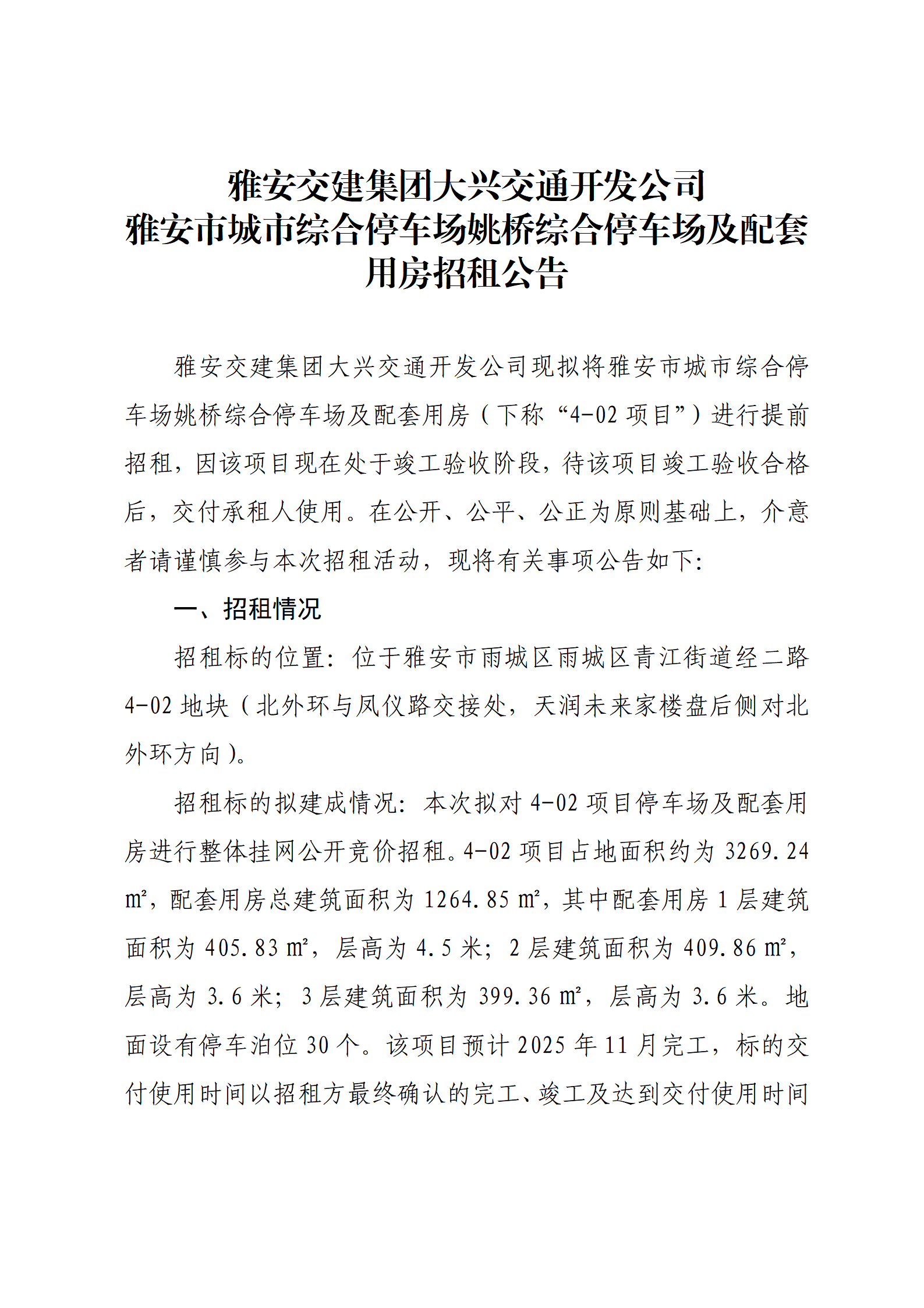 雅安交建集團大興交通開發(fā)公司 雅安市城市綜合停車場姚橋綜合停車場及配套用房招租公告