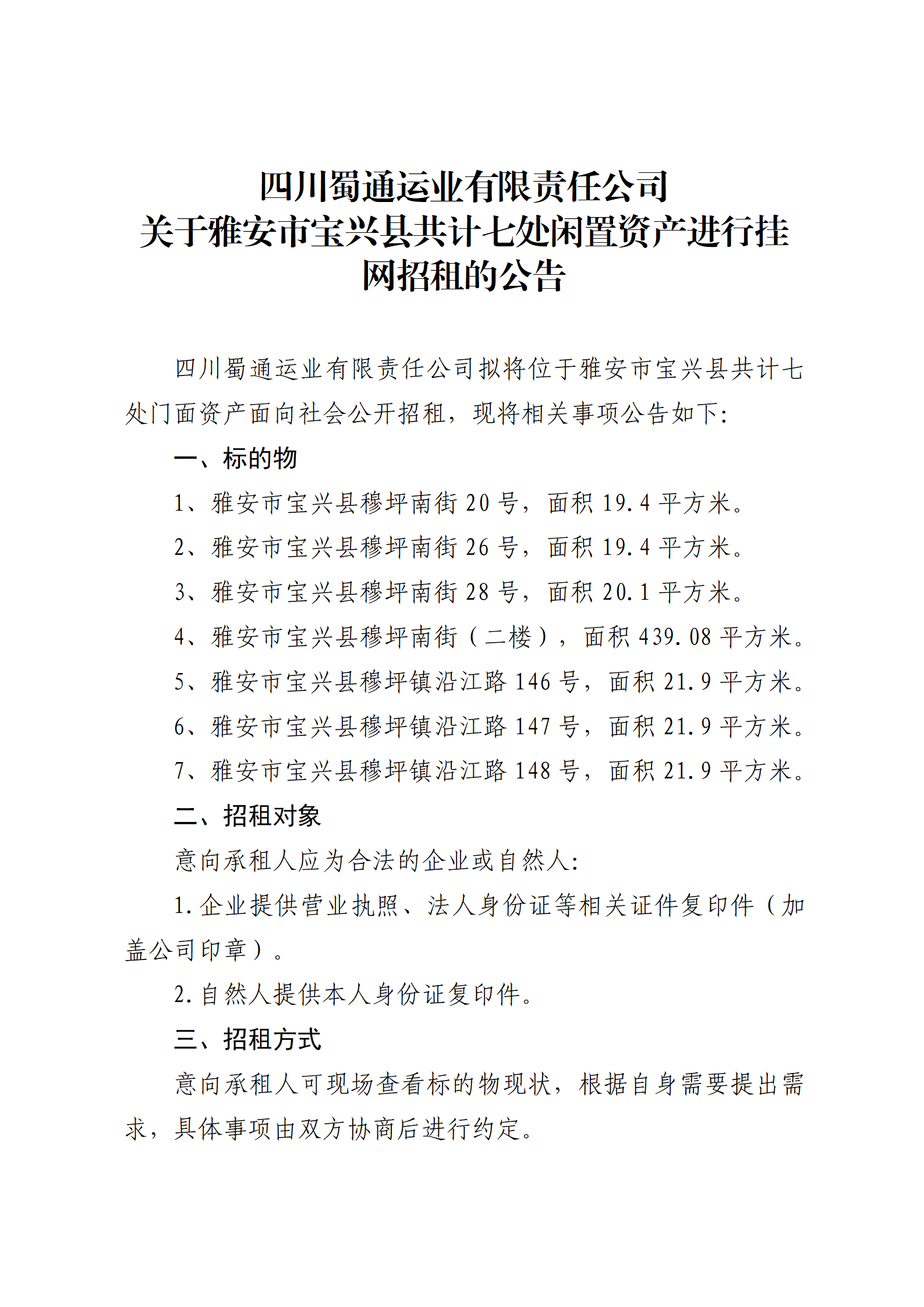 四川蜀通運業(yè)有限責(zé)任公司 關(guān)于雅安市寶興縣共計七處閑置資產(chǎn)進(jìn)行掛網(wǎng)招租的公告