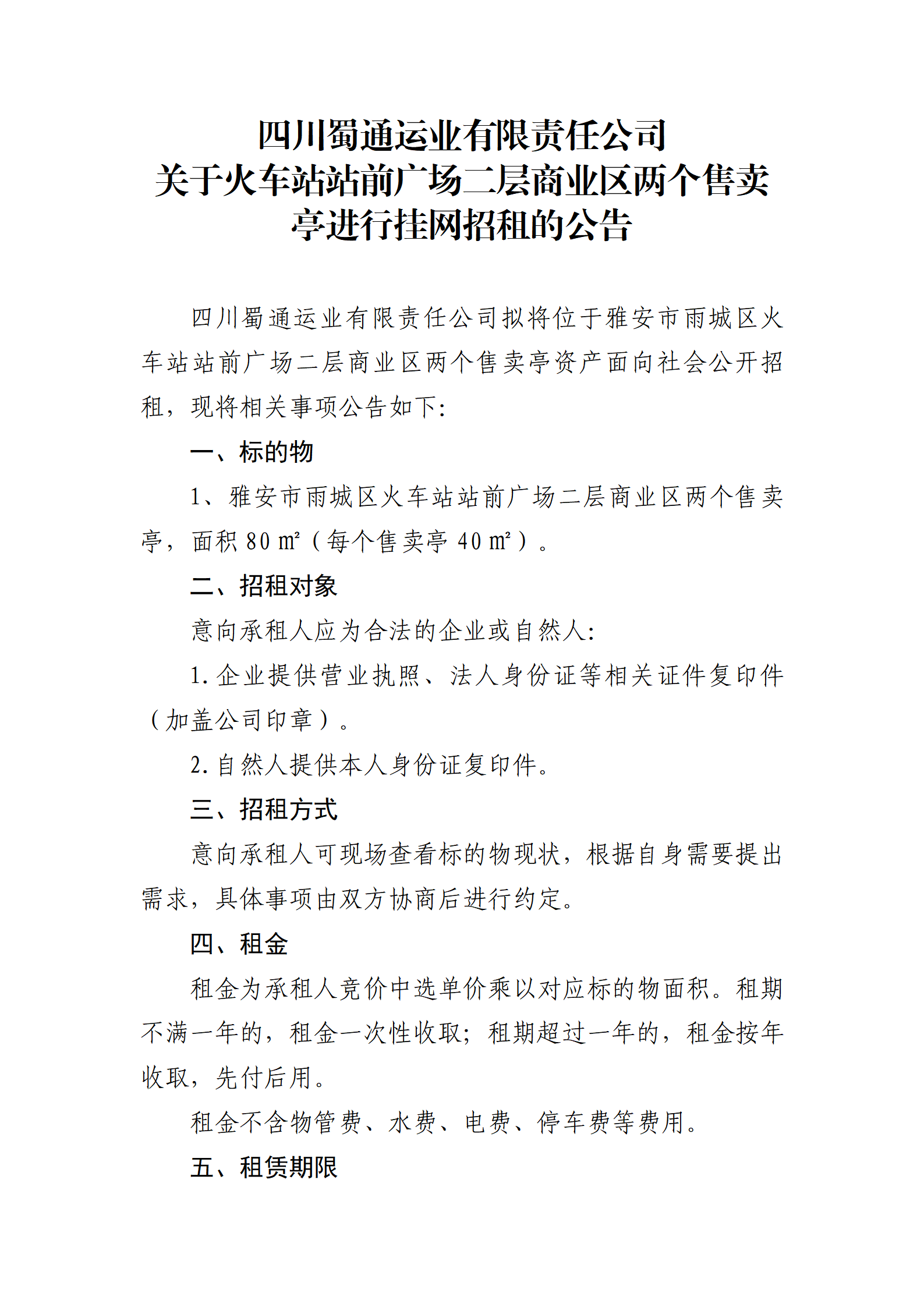 四川蜀通運業(yè)有限責(zé)任公司關(guān)于火車站站前廣場二層商業(yè)區(qū)兩個售賣亭進(jìn)行掛網(wǎng)招租的公告