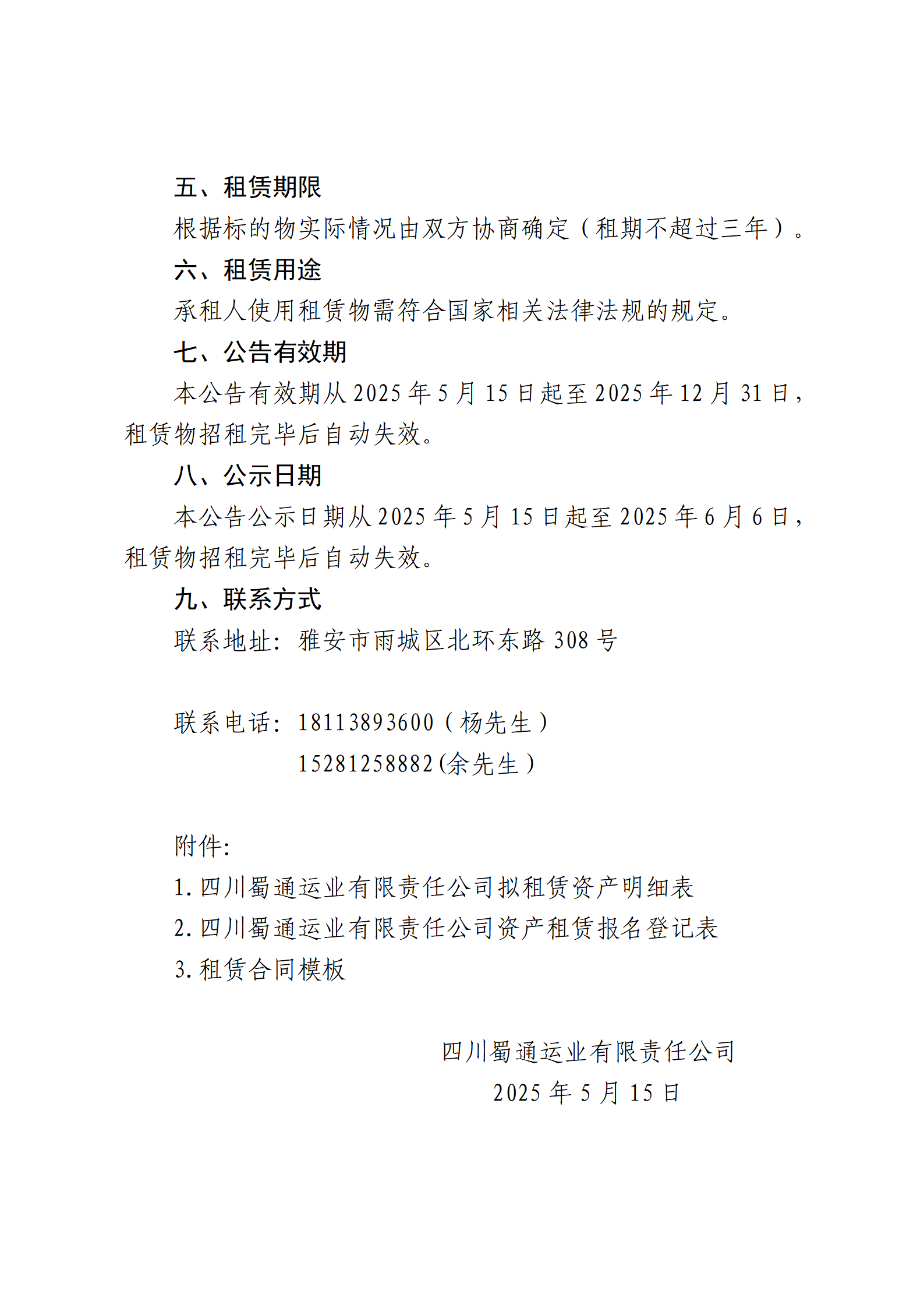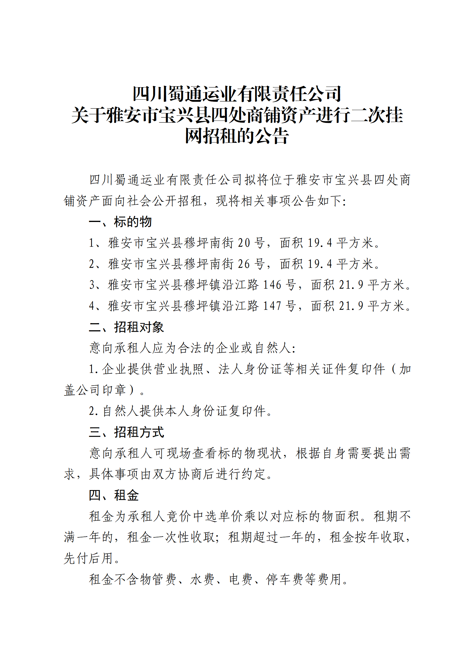 四川蜀通運業(yè)有限責(zé)任公司 關(guān)于雅安市寶興縣四處商鋪資產(chǎn)進行二次掛網(wǎng)招租的公告