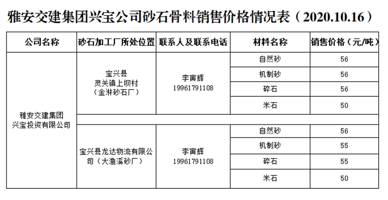 ÑŰ²½»½¨¼¯ˆFÅdŒš¹«Ë¾É°Ê¯¹ÇÁÏäNÊÛƒr¸ñÇé›r±í£¨2020.10.16£©