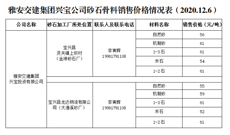 雅安交建集團(tuán)興寶公司砂石骨料銷售價格情況表(2020.12.6)
