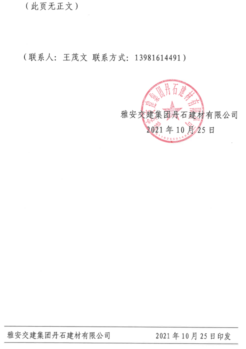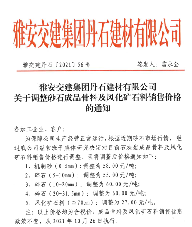 雅安交建集團丹石公司關(guān)于調(diào)整成品骨料及風(fēng)化礦石料銷售價格的通知(2021.10.26)