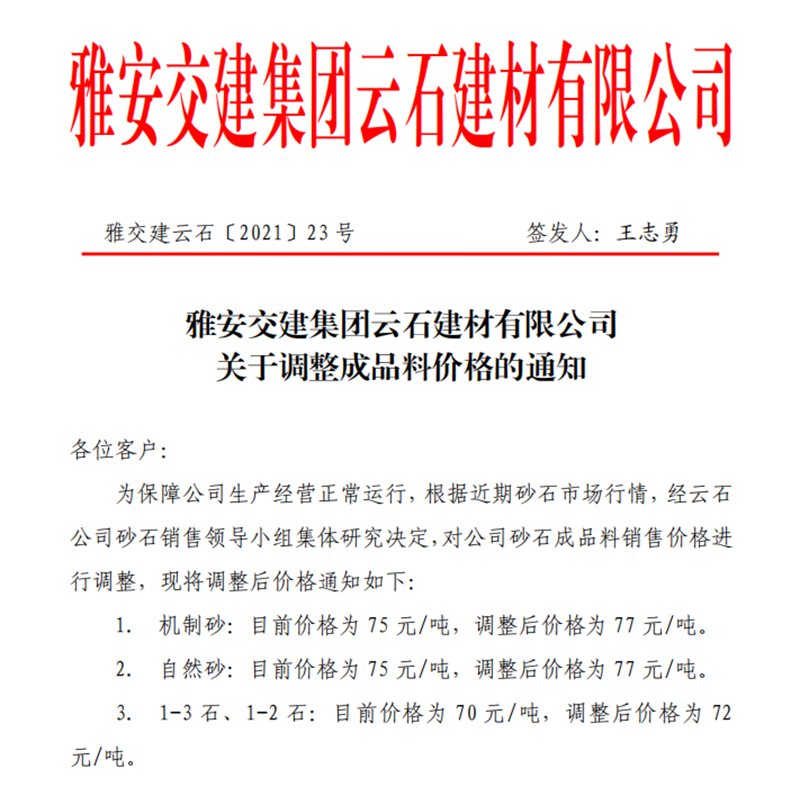 雅安交建集團云石公司砂石骨料銷售價格情況表(2021.5.14)