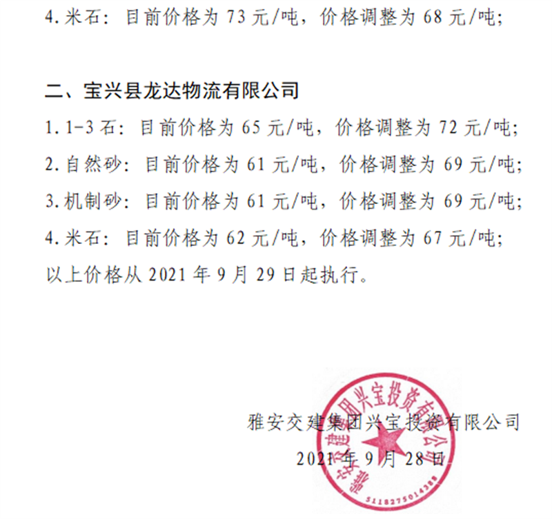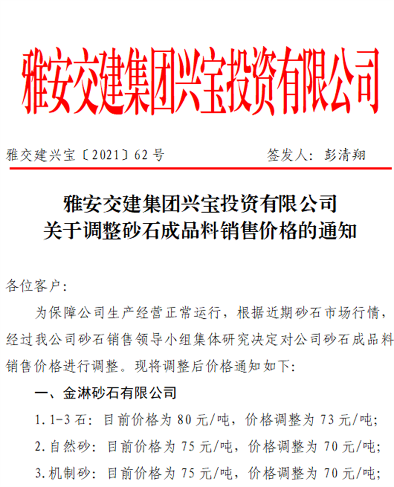 雅安交建集團興寶公司關于調(diào)整砂石成品料銷售價格的通知(2021.9.28)