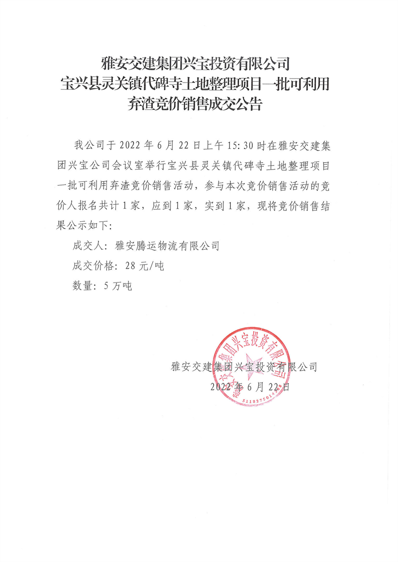 雅安交建集團(tuán)興寶投資有限公司 關(guān)于調(diào)整砂石成品料銷(xiāo)售價(jià)格的通知(2022-6-22)