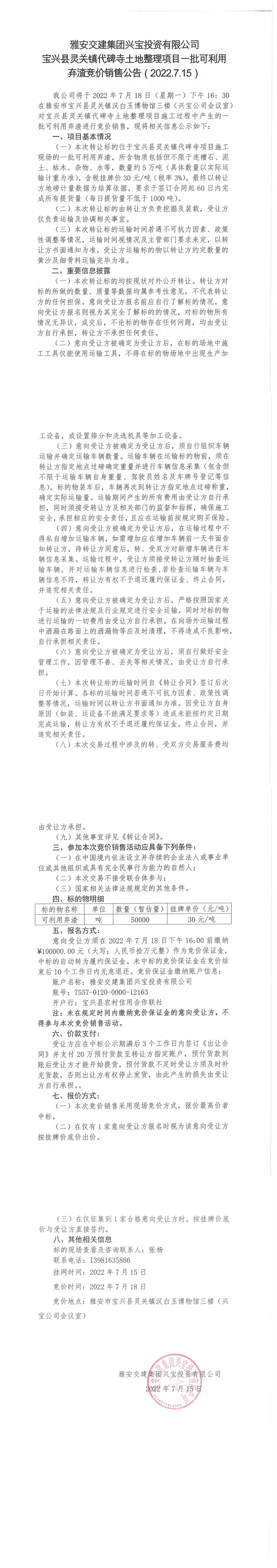 寶興縣靈關(guān)鎮(zhèn)代碑寺土地整理項(xiàng)目一批可利用棄渣競(jìng)價(jià)銷(xiāo)售公告7.15(5萬(wàn)噸)