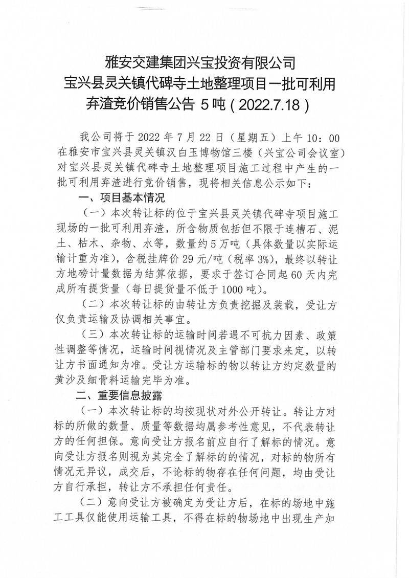 寶興縣靈關(guān)鎮(zhèn)代碑寺土地整理項(xiàng)目一批可利用棄渣競(jìng)價(jià)銷售公告7.15(5萬噸)