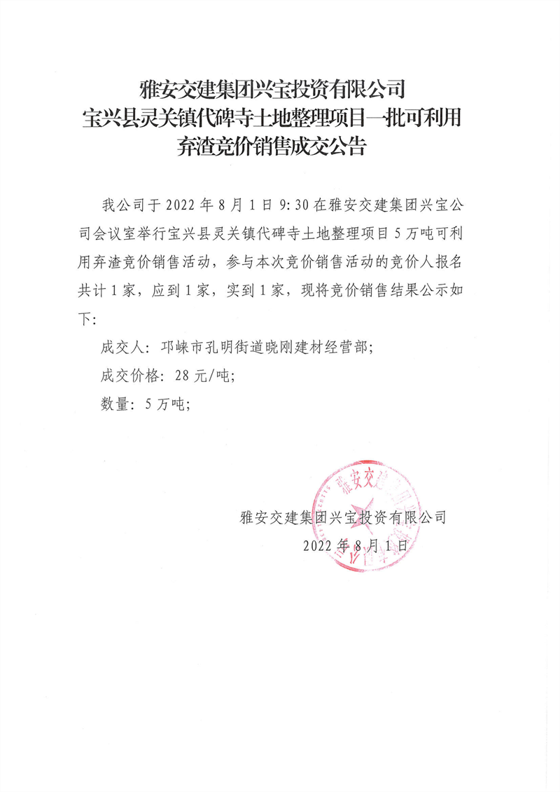 雅安交建集團興寶投資有限公司靈關鎮(zhèn)代碑寺土地整理項目5萬噸可利用棄渣競價銷售成交公告(2022.8.1)