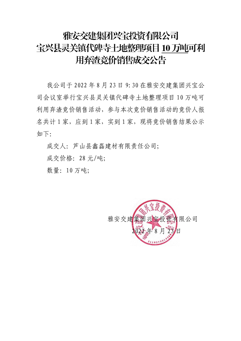 雅安交建集團(tuán)興寶投資有限公司寶興縣靈關(guān)鎮(zhèn)代碑寺土地整理項(xiàng)目5萬噸可利用棄渣競價銷售成交公告(8.23)