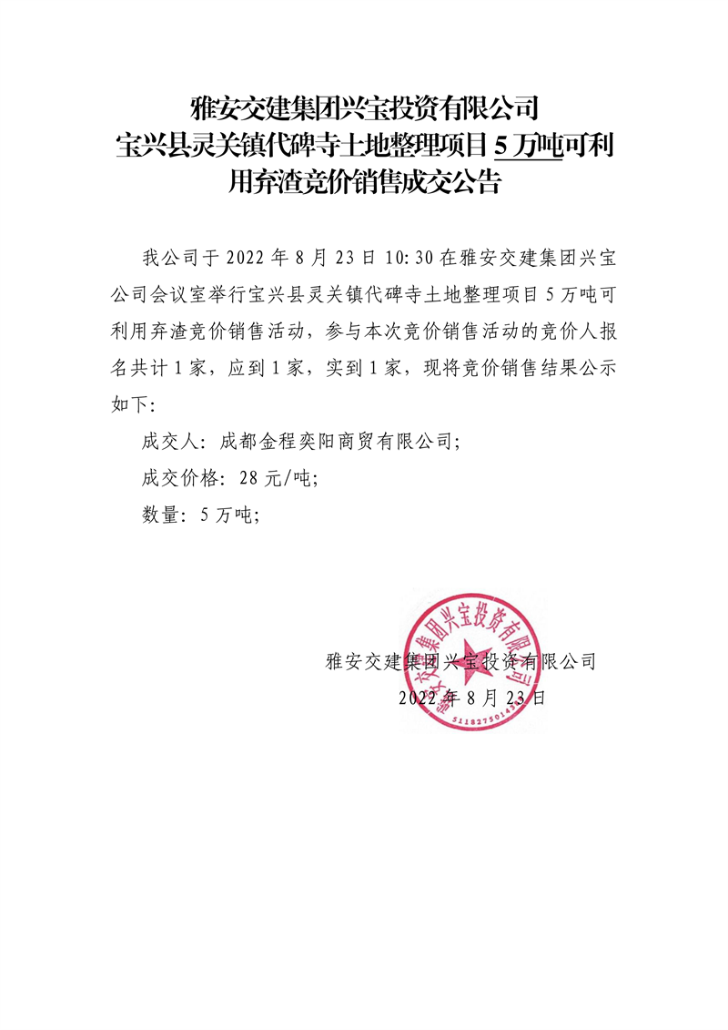 雅安交建集團(tuán)興寶投資有限公司寶興縣靈關(guān)鎮(zhèn)代碑寺土地整理項(xiàng)目5萬噸可利用棄渣競價(jià)銷售成交公告(8.23)