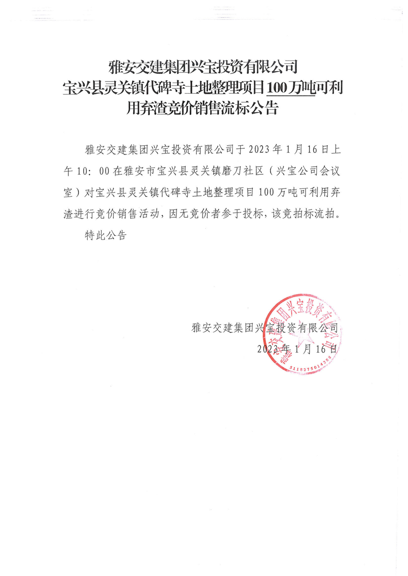 雅安交建集團(tuán)興寶投資有限公司100萬(wàn)噸可利用棄渣競(jìng)價(jià)銷(xiāo)售流標(biāo)公告(2023.1.16)
