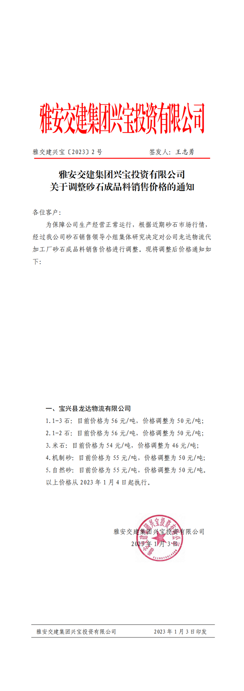 雅交建興寶〔2023〕2號 關于調整砂石成品料銷售價格的通知-2023-01-03