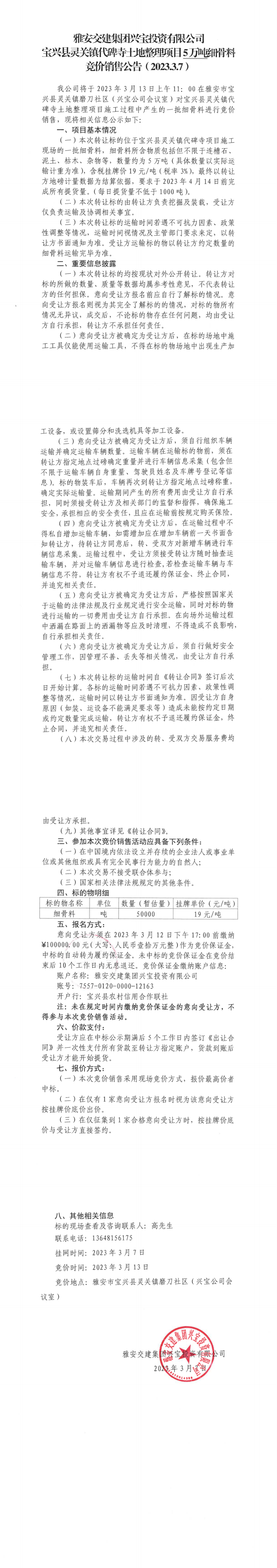 雅安交建集團(tuán)興寶投資有限公司寶興縣靈關(guān)鎮(zhèn)代碑寺土地整理項(xiàng)目5萬噸細(xì)骨料競(jìng)價(jià)銷售公告(2023.3.7)