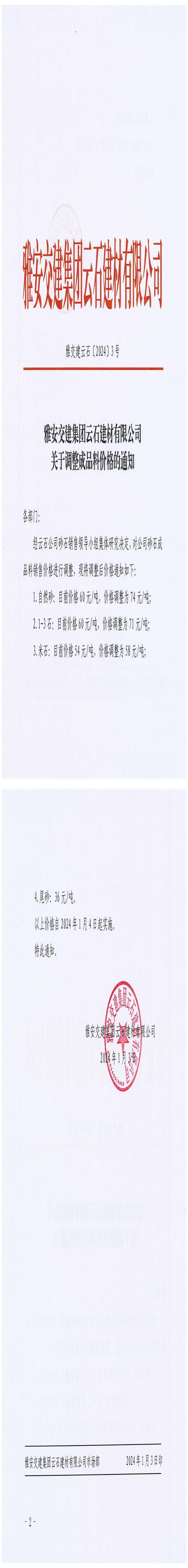 雅安交建集團(tuán)云石建材有限公司成品料價(jià)格調(diào)整公告(2024-01-04)